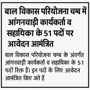अधिक जानकारी के लिए उम्मीदवार बाल विकास परियोजना अधिकारी, चम्बा के कार्यालय अथवा संबंधित आंगनबाड़ी केंद्र के वृत्त पर्यवेक्षक कार्यालय से संपर्क कर सकती हैं।