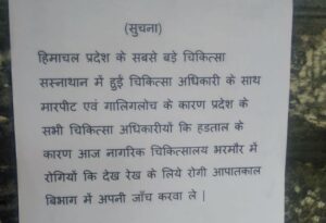 घोघड़, चम्बा 26 दिसम्बर : IGMC शिमला में डॉ व मरीज के बीच हुई मारपीट के बाद चिकित्सक संघ ने आज 26 दिसम्बर 2025 को सामान्य OPD (बाह्य रोगी जांच विभाग) बंद रखने का निर्णय लिया था। चिकित्सक संघ के आह्वान पर भरमौर क्षेत्र के अस्पतालों में भी चिकित्सकों ने आज अस्पताल पहुंचने वाले मरीजों की जांच सामान्य ओपीडी में नहीं की।