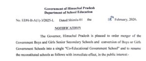 घोघड़, शिमला, 18 फरवरी 2026 : शिक्षा विभाग द्वारा जारी अधिसूचना के अनुसार हिमाचल प्रदेश के विभिन्न जिलों में स्थित लड़कों व लड़कियों के राजकीय वरिष्ठ माध्यमिक विद्यालयों का विलय कर उन्हें सह-शिक्षा (Co-Educational) विद्यालय के रूप में पुनर्गठित व नामांकित किया गया है।