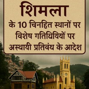 घोघड़, शिमला, 02 फरवरी 2026 : शिमला शहर में कानून-व्यवस्था और सार्वजनिक शांति बनाए रखने के उद्देश्य से जिला प्रशासन ने कुछ प्रमुख क्षेत्रों में सार्वजनिक गतिविधियों पर अस्थायी प्रतिबंध लगाए हैं। जिला दंडाधिकारी शिमला अनुपम कश्यप द्वारा पंजाब राज्य सुरक्षा अधिनियम, 1953 की धारा 6 के तहत जारी आदेशों के अनुसार शहर के 10 चिन्हित स्थानों पर सार्वजनिक बैठकें, धरना-प्रदर्शन, जुलूस, रैलियां, नारेबाजी, बैंड बजाना तथा हथियार के रूप में इस्तेमाल की जा सकने वाली वस्तुओं को ले जाने पर पूर्ण प्रतिबंध रहेगा।