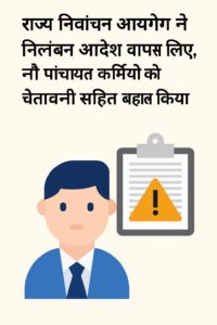 घोघड़, शिमला/चंबा/मंडी, 20 नवम्बर : राज्य निर्वाचन आयोग हिमाचल प्रदेश ने 23 अक्टूबर 2025 को जारी निलंबन आदेशों को वापस लेते हुए विकासखंड भरमौर और विकासखंड निहरी के कुल 9 पंचायत अधिकारियों व कर्मचारियों को सेवा में बहाल कर दिया है। आयोग ने इन अधिकारियों को चुनाव संबंधी कार्यों में लापरवाही बरतने पर कड़ी चेतावनी (reprimand) भी जारी की है।