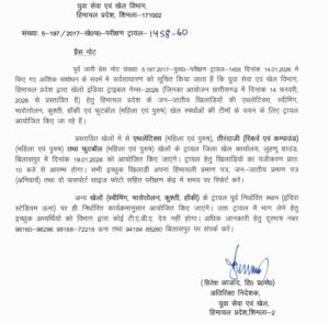 घोघड़, शिमला/ऊना/बिलासपुर, 17 जनवरी : हिमाचल प्रदेश के जनजातीय खिलाड़ियों के लिए वर्ष 2026 में आयोजित की जाने वाली राज्य स्तरीय खेल प्रतियोगिताओं के लिए चयन ट्रायल की तिथियों व स्थानों की जानकारी जारी कर दी गई है। युवा सेवा एवं खेल विभाग, हिमाचल प्रदेश द्वारा जारी संशोधित प्रेस नोट के अनुसार ये ट्रायल विभिन्न खेलों में पुरुष एवं महिला वर्ग के लिए आयोजित किए जाएंगे।